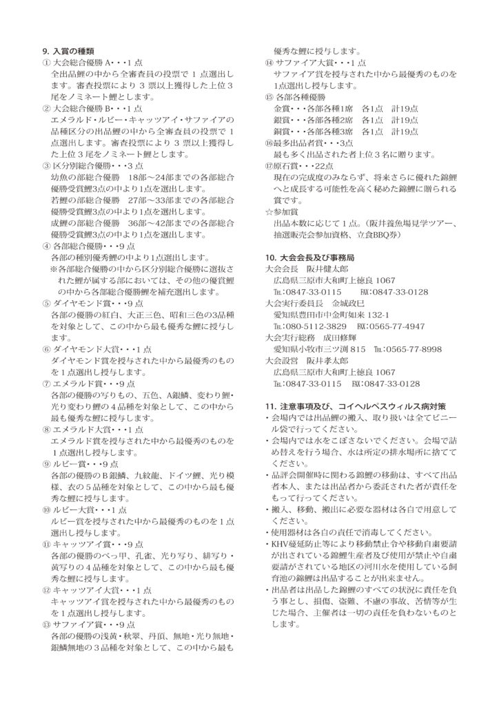 また、1日開催という限られた時間の中でも愛好家に存分に楽しんでもらおうと、阪井健太郎氏による養魚場見学ツアーをはじめ、同場作出鯉の抽選販売会、立食BBQなど豪華な出品者特典も用意されている。 大会詳細は実施要項ほか、本クラブのサイトをご覧下さい。