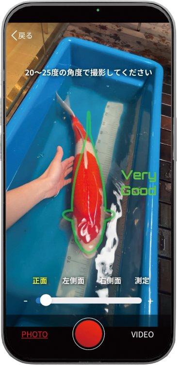 〈写真〉 鯉の頭を下にして、表示されるガイドに沿って「正面写真」を撮影。体はまっすぐで口は閉じ、ヒレが開いている瞬間を狙うのがポイント。
