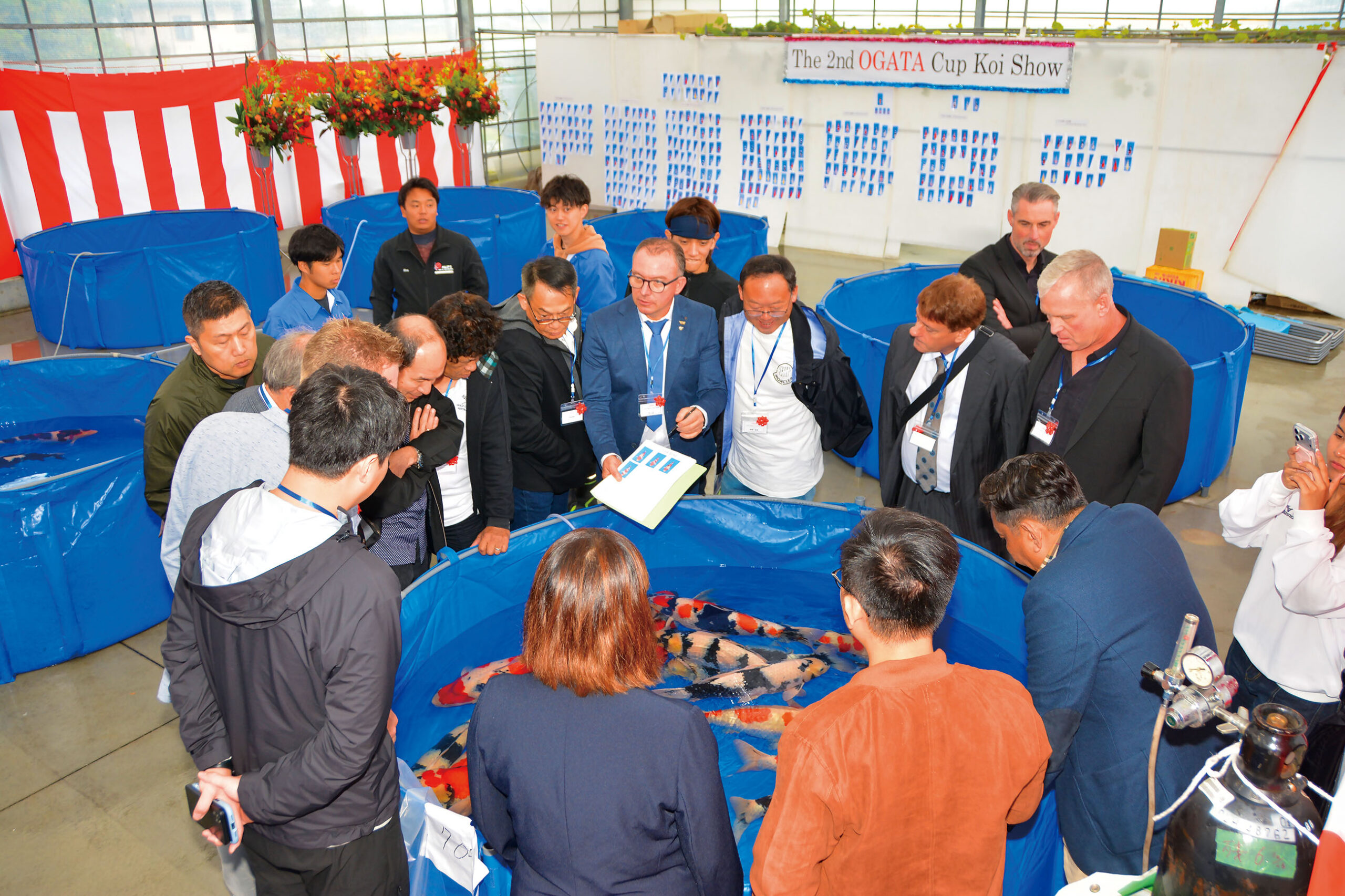 10月31日㈮、福岡県久留米市の㈱尾形養鯉場で「第2回尾形カップ品評会」が開催され、国内外の業者が集った会場は熱気に包まれていた。