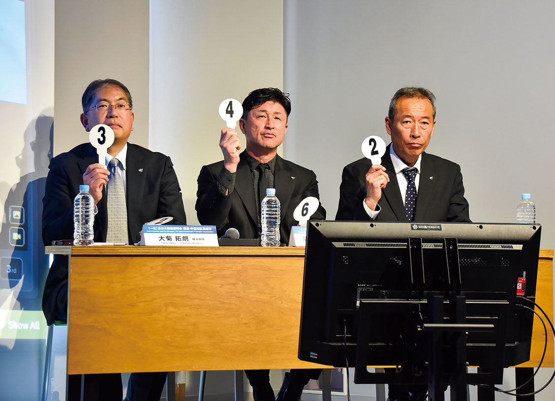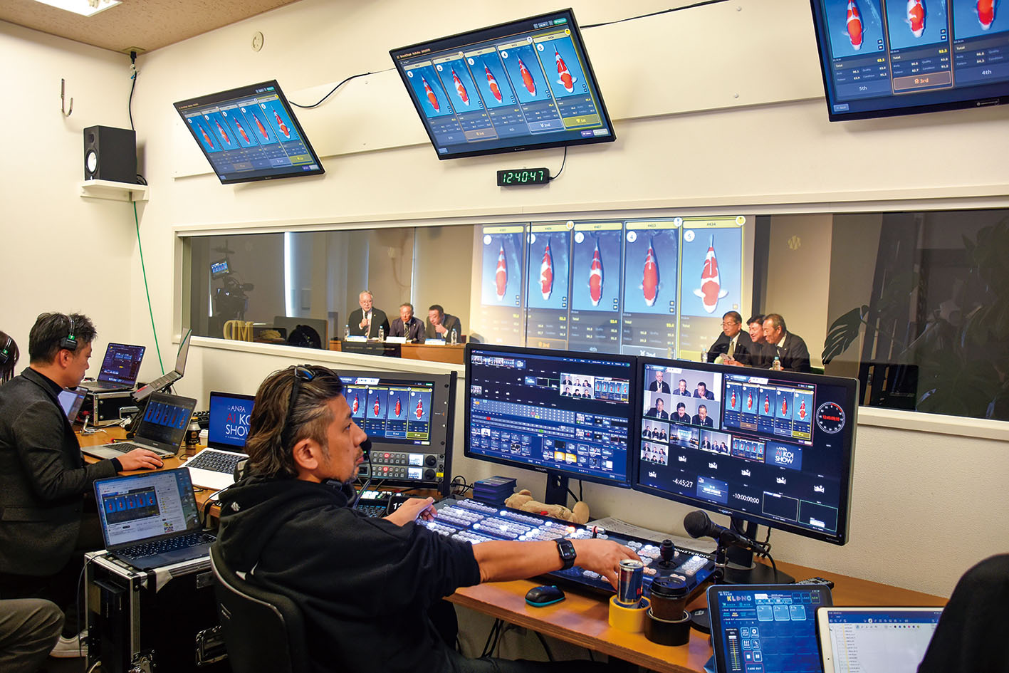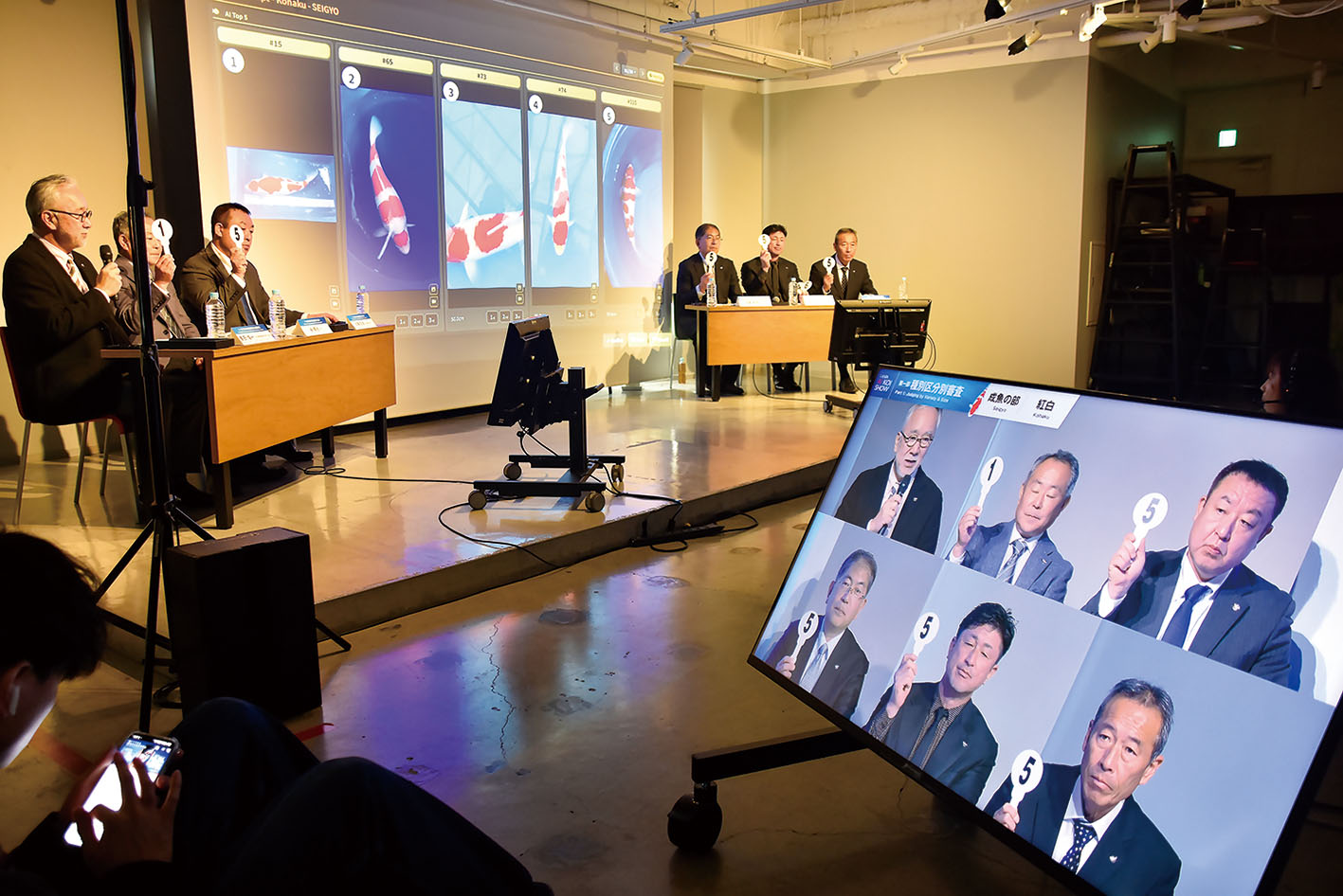 当日はMONSTER STUDIO乃木坂(東京都港区)を会場に収録とライブ配信が行われ、吉田俊一振興会副理事長の司会のもと、谷健治(㈱タニ)、近藤知由(近藤養魚場㈱)、大菊拓朗(横浜錦鯉)、間野弘(大日養鯉場㈱トヨタ店)、丸山太(㈱丸山養鯉場)の5氏が審査を務めた。
