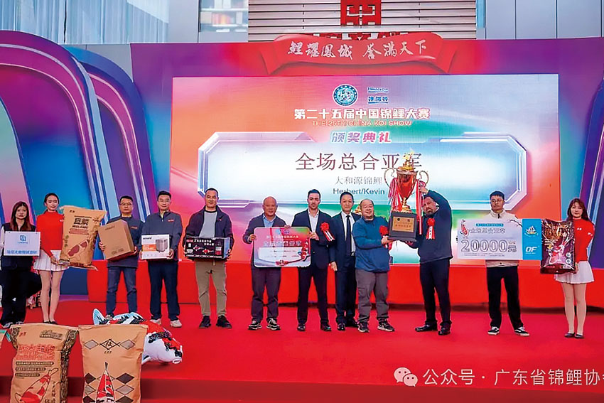 全体総合優勝2位は、Herbert・Kevin氏出品の大正三色(㈱阪井養魚場作出)、同3位は連运增氏出品の紅白(国魚館作出)で、ともに大和源錦鯉の取り扱い。