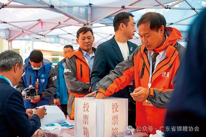 審査当日は厳しい寒さに雨が降り続く悪天候となったが、審査員らは計189の賞を選出。全体総合優勝の投票では、85部および85超部の出品鯉を対象にそれぞれの審査員が3尾ずつ選び、得票数上位5尾で2回目の投票へ。その結果、朱軍氏出品の85超部昭和三色が、43票という圧倒的な支持を得てチャンピオンとなった。