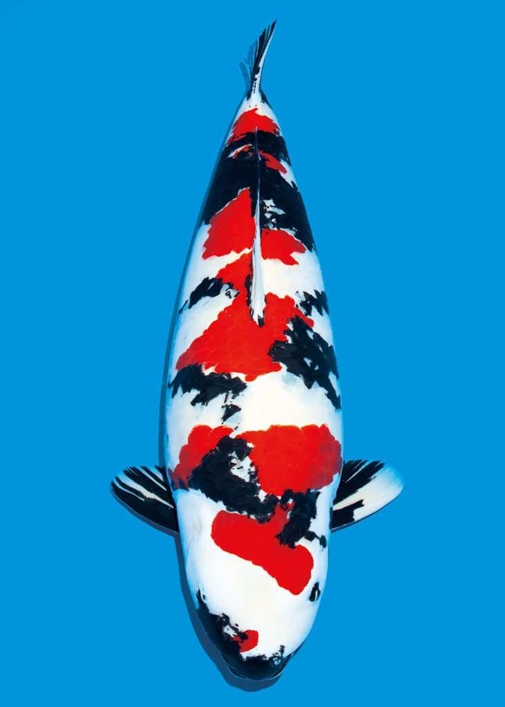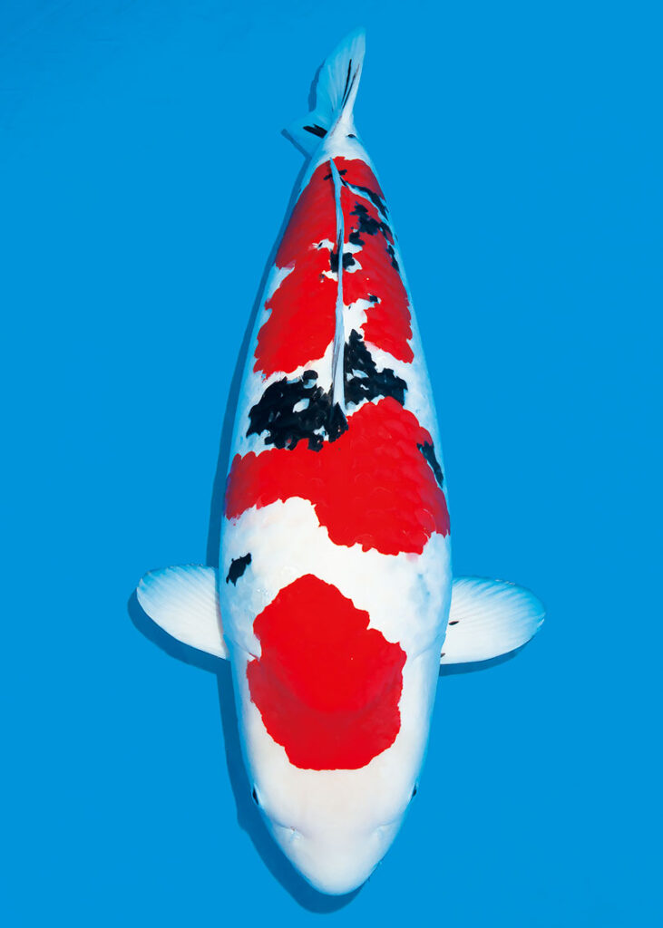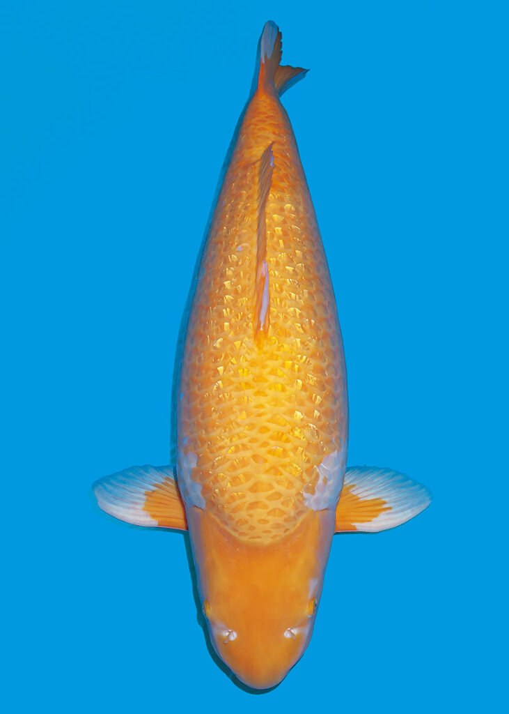 岡山桃太郎鯉作出で7歳90㎝。6〜7年前に㈱オダカンのオダカンカップ売り出しで23㎝時に購入。以降は野池には入れずに泉水で飼育したという。取り扱いは福岡県のおもて錦。