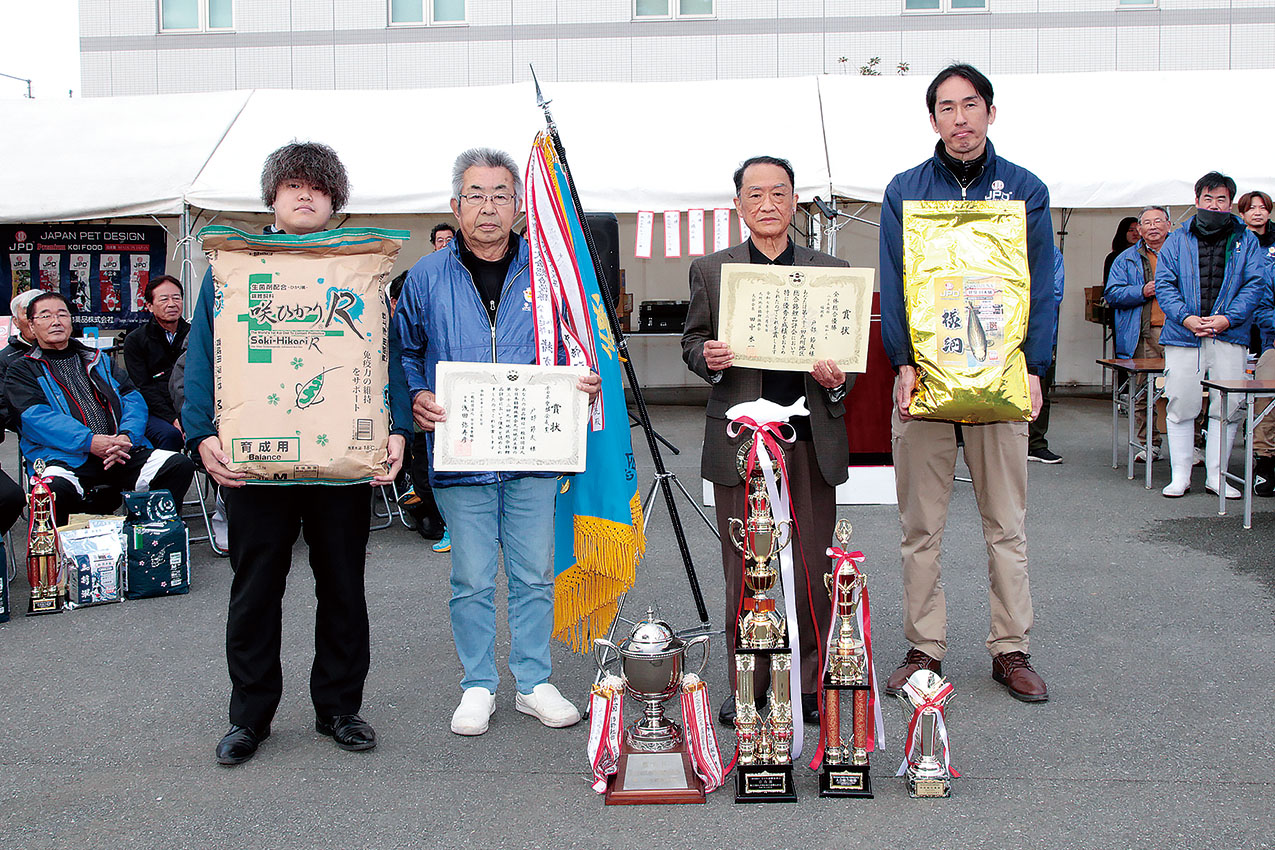 今大会の審査員は、1班が前田大輔(岡山桃太郎鯉)、高橋美行(一品家)、高延典敬(㈱大石養魚場)、2班が大菊拓朗(横浜錦鯉)、飯塚敬浩(㈲松江錦鯉センター)、長島保(長島養鯉場)の計6名。全体総合優勝は全員による審査の結果、戸部節夫出品の85超部昭和三色が受賞した。