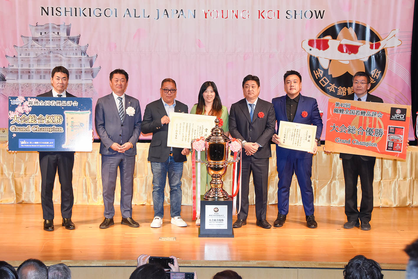 全審査員がかたずをのんで見守る中で進む開票作業。入念な確認を経て、大会役員から発せられた注目のアナウンスは「大会総合優勝は63部オス昭和三色に決定しました」。接戦の末、わずか1票差で頂点に立った昭和三色はインドネシアのArthur kai氏出品で、同氏は本品評会で初の総合、インドネシア人としては2016年のHernando Yuwono氏以来の受賞となった。大日養鯉場㈱作出の2歳オス62㎝で、取扱はKOI-UMEDA JAPAN㈱。