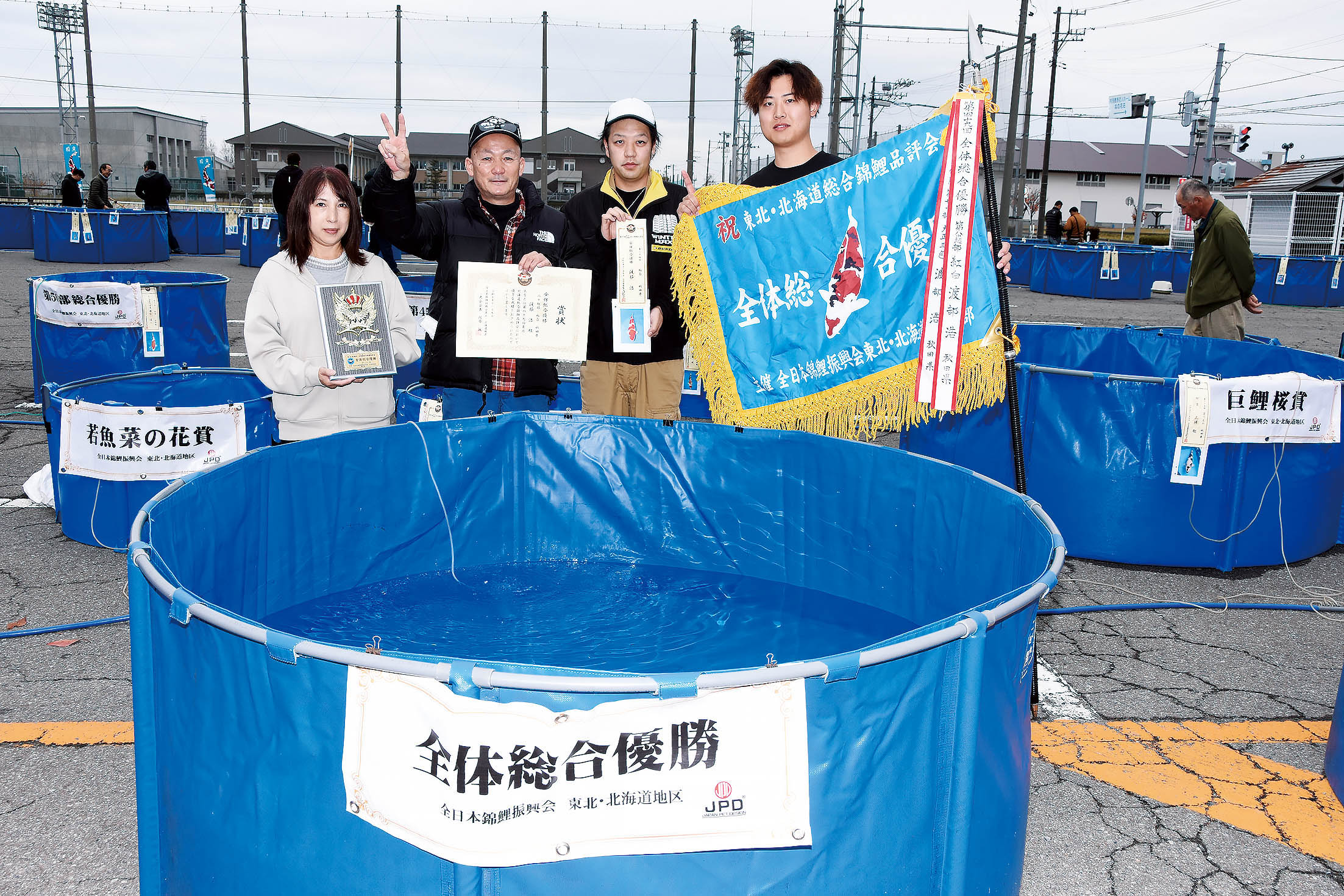 丸堂養鯉場㈱作出の5歳82㎝。鯉牧場(北海道)が仕入れ渡部氏が入手したもので、渡部氏は本大会連覇、鯉牧場は3年連続の全体総合取り扱いとなった。その他の上位入賞は、巨鯉総合優勝/80部大正三色/清野和幸、オス総合優勝/オス70超部昭和三色/鯉牧場、壮魚総合優勝/70部金銀鱗/鯉牧場、成魚総合優勝/55部紅白/佐々木晃男、若魚総合優勝/35部紅白/斎藤進、幼魚総合優勝/20部金銀鱗/木戸寛丈、ジャンボ賞/80超部光り無地/清野和幸、桜大賞/60部五色/渡部浩、菜の花大賞/75部浅黄/尾形順一。