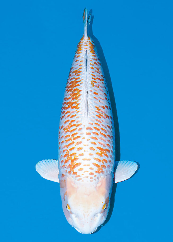 御三家以外の品種から選ばれる金鯱大賞には、Herbert Fritch氏(アメリカ)出品の90部逸品ものが選ばれ、こちらも成田養魚園㈱で行われた「 Collection 2024」でFitzs Fish Pondsを介して入手。㈲丸誠養鯉場(新潟)作出の黄金落ち葉系統の光り変わり鯉で、7歳92㎝。