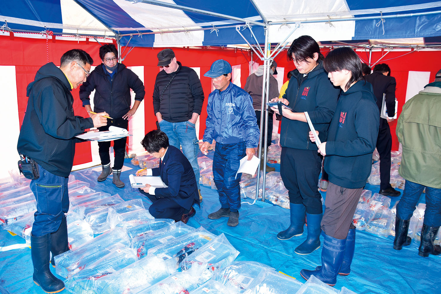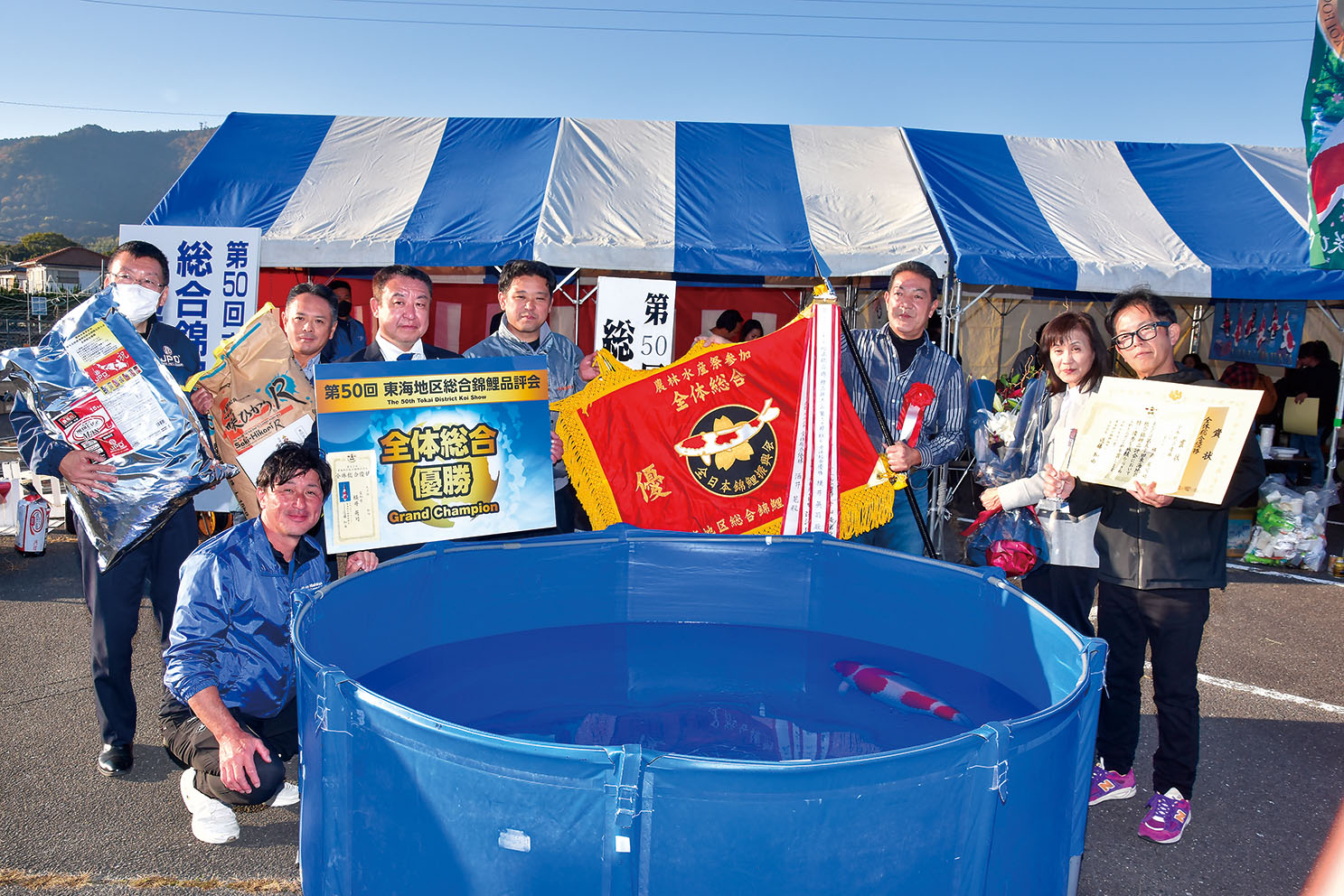 11月30日㈰、晴天が広がった三重県桑名市・Fマート多度店の駐車場を会場に、第50回東海地区総合錦鯉品評会が開催された。
