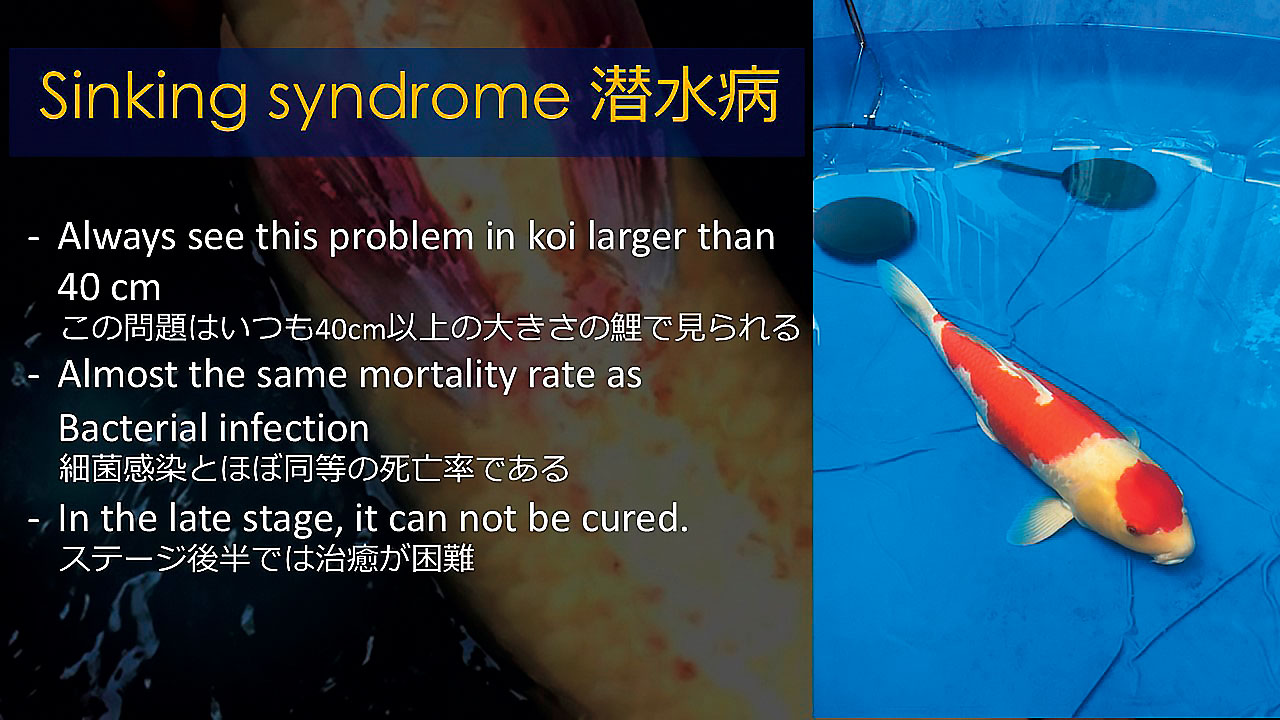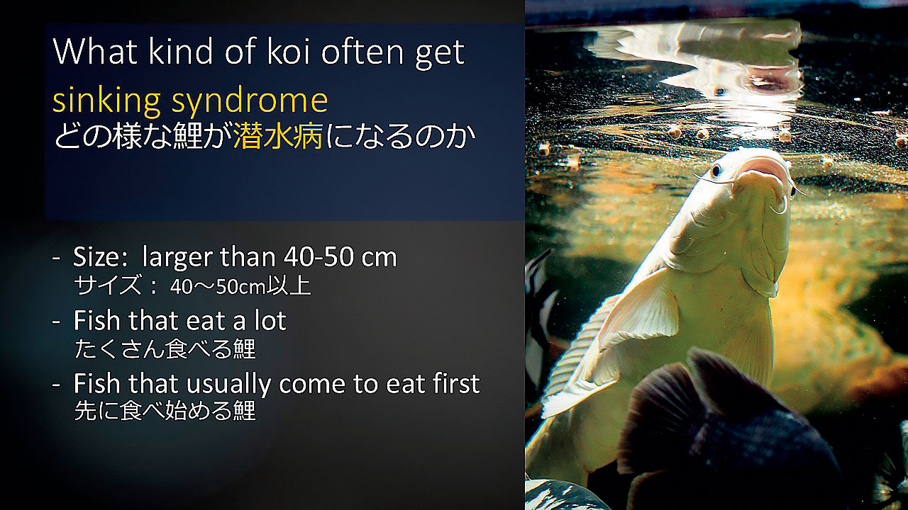 Next, I would like to discuss Sinking Syndrome. It is understood that this condition is caused by the swim bladder becoming compressed within the body. Typical symptoms include repeated vertical swimming movements, and eventually the koi will remain at the bottom, struggling and fluttering its fins. It most commonly occurs in koi aged 4 or older, and is rarely seen in younger koi measuring around 30 cm.