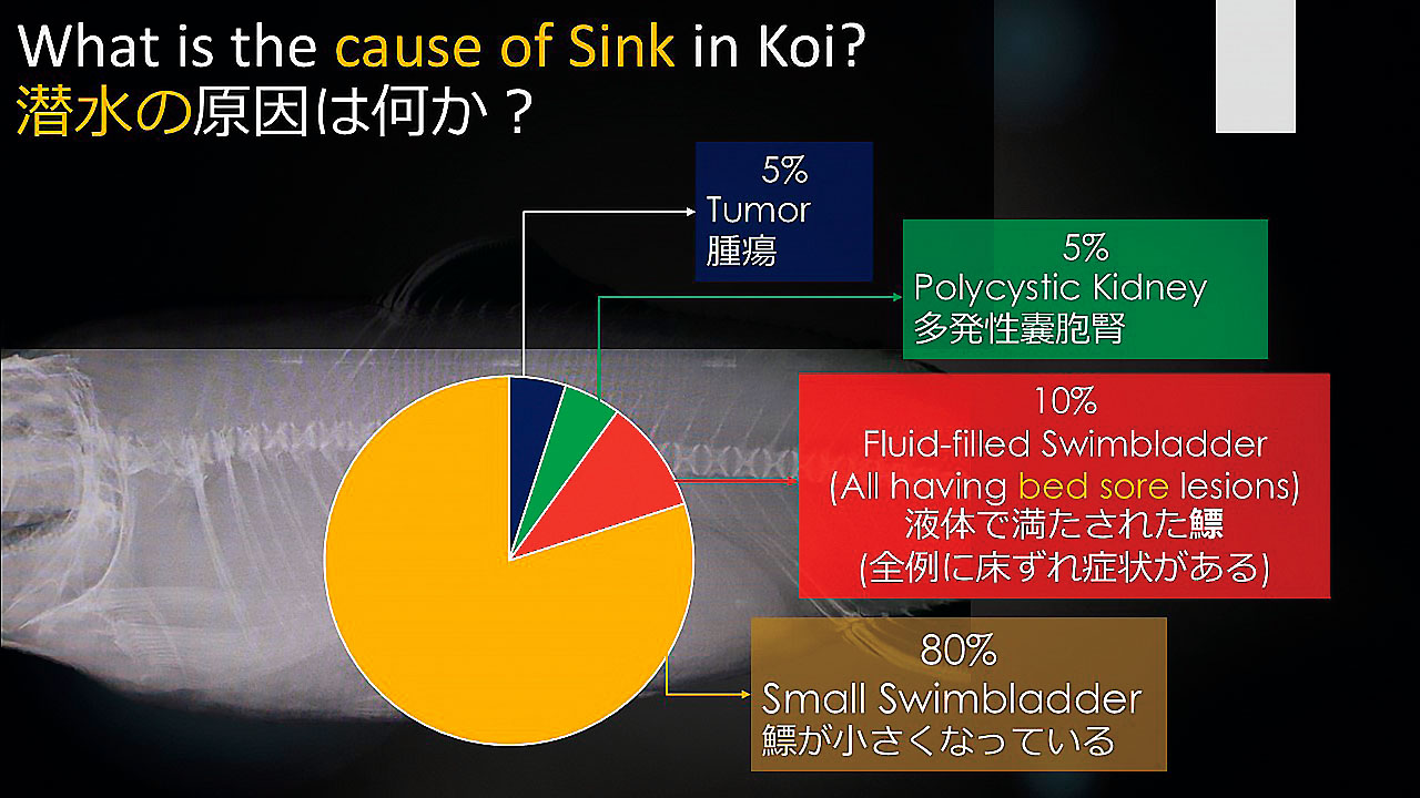 However, this did not reveal the true cause, so we examined around 30 koi in the early stages of the condition. What they had in common was that their swim bladders were compressed and filled with fluid. In other words, Sinking Syndrome is a condition caused by a disorder of the swim bladder.